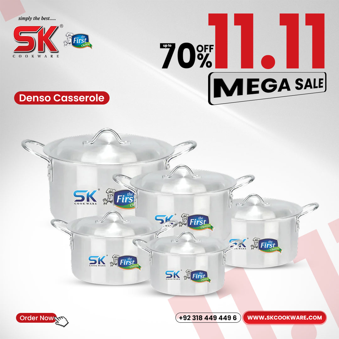 SK 10 Pieces Aluminum Denso Casserole Set - 19 to 28 cm is designed for Every Pakistani Home because we have the best cookware products with high-quality materials and premium manufacturing. If you want to get delivered to your home then do order now SK Cookware provides a facility of Cash on Delivery all over Pakistan. SK Cookware is the perfect fit for your home. This high-quality casserole is a great helper for your kitchen, saving time and effort without having to spend a lot of time cleaning. It can bring delicious and healthy dishes to your family.