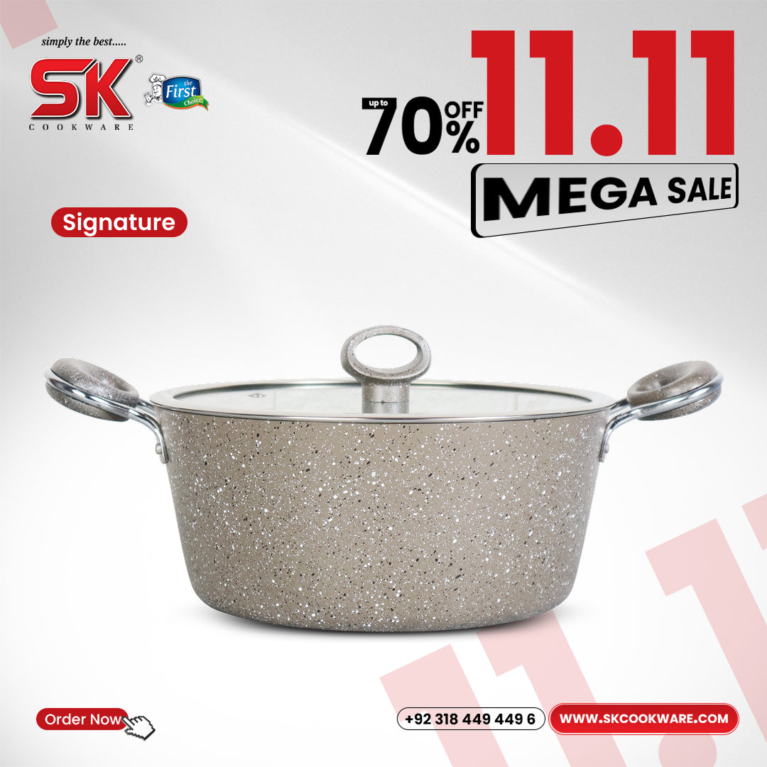 SK Cookware is the No.1 Cookware and Kitchenware Brand in Pakistan. Our Marble Coated Non-Stick casserole (Daigchi/Handi) is produced from premium quality aluminum alloy 3003, a food-grade material that is not a health hazard.